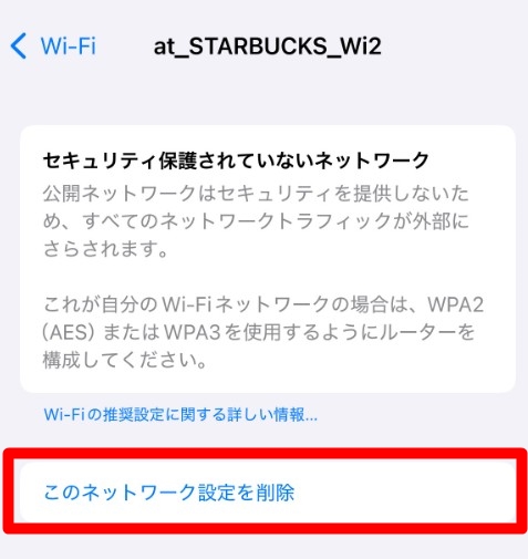 手順4 ログイン画面が出てこない時は、「このネットワーク設定を削除する」から一旦削除する