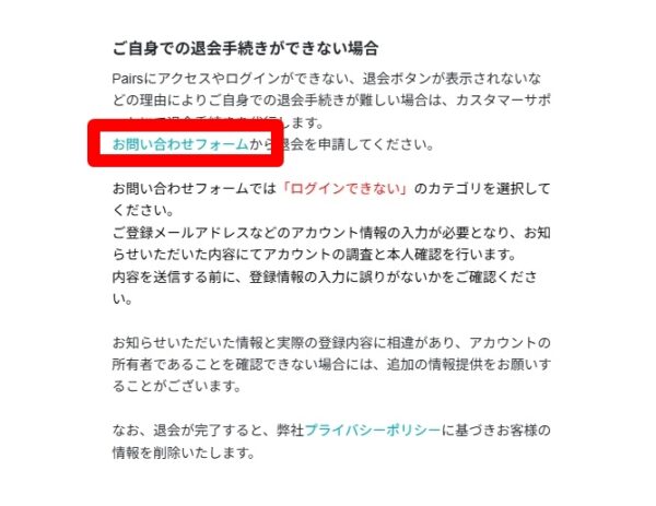 ご自身での退会手続きができない場合の所にある「お問い合わせフォーム」にアクセスしてください。