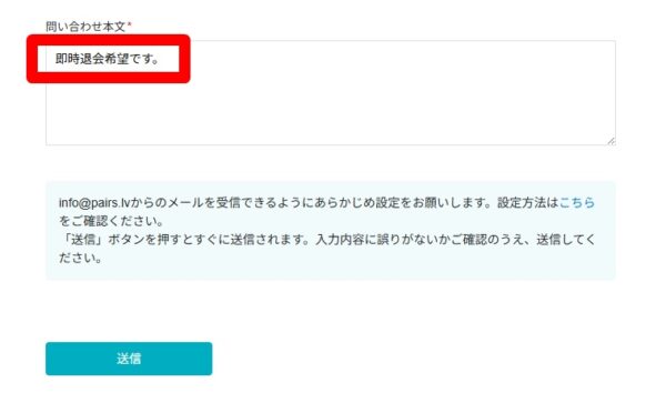 問い合わせ本文に「即時退会希望」と記入して送信をしてください。