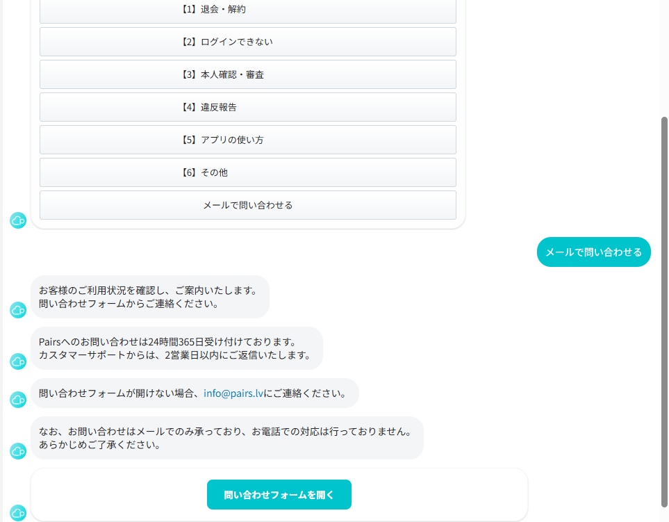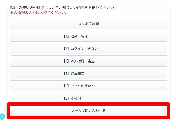 このページが表示されたら「メールで問い合わせる」をクリックします。