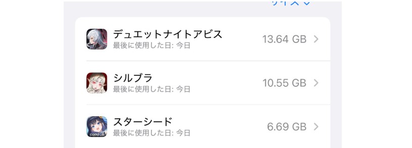普段使ってないアプリやもうプレイしないゲームなどは削除してしまいましょう。特にスマホのストレージの多くの部分を占めるアプリから順番に削除すると良いです。スマホゲームアプリはかなりの容量を取っている可能性があるので、そういったものはもうゲームをしてなかったり、ログインボーナスを受け取るだけになっているような場合には、データ連携を済ませた上でいつでもまた復活できるようにした上で、アンインストールすると良いでしょう。また、やりたいときにはインストールしてデータ連携をすれば戻せるようにしておいてください。