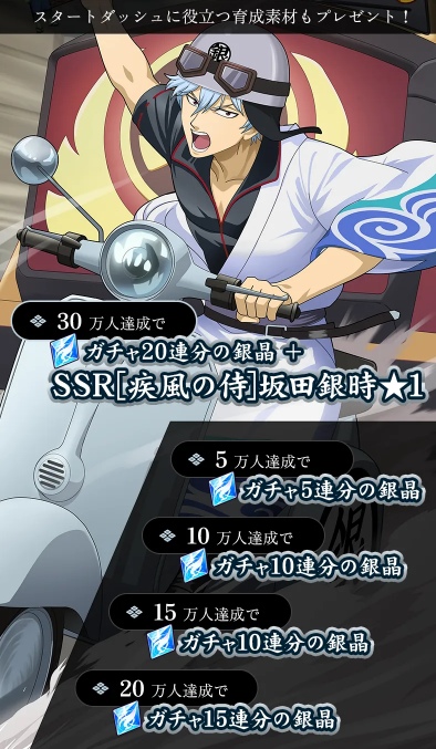 事前登録特典は上のように表示されています。ガチャ石としては、銀晶が使われるようです。また、SSRの疾風の侍 坂田銀時星1が配布されることがわかります。