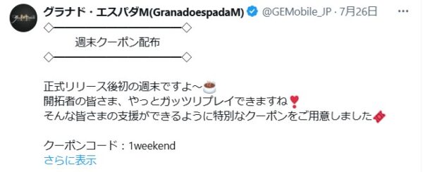 『グラナドエスパダM』で有効なクーポンコード(シリアルコード・交換コード)をまとめました。クーポンコードを使うことでさまざまな特典をもらうことができます。