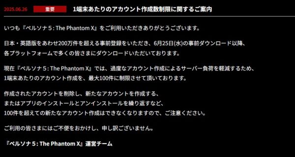 現在『ペルソナ5: The Phantom X』では、過度なアカウント作成によるサーバー負荷を軽減するため、