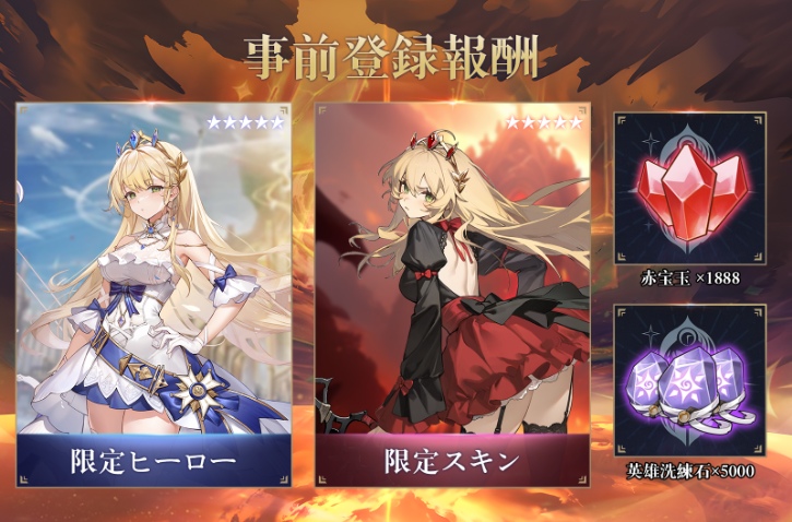 現在は事前登録をしており、限定ヒーローや限定スキン、更には赤宝玉1888個、英雄洗練石5000個といった報酬を獲得できます。
