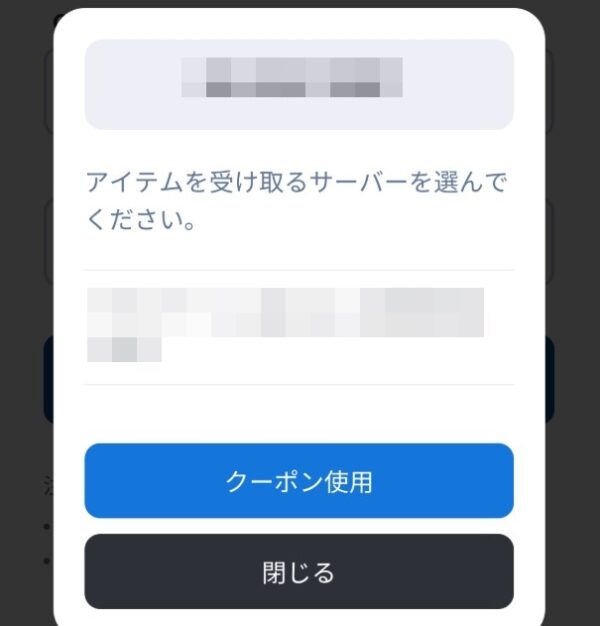 | 入力する | アイテムを受け取るサーバーを選択してください。1回限りしか使えないので、間違わないように。