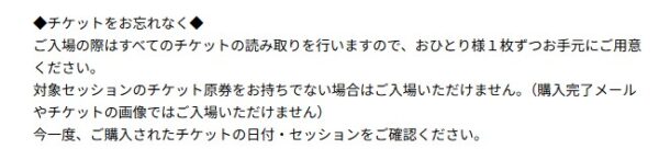 対象セッションのチケット原券をお持ちでない場合はご入場いただけません。(購入完了メールやチケットの画像ではご入場いただけません)