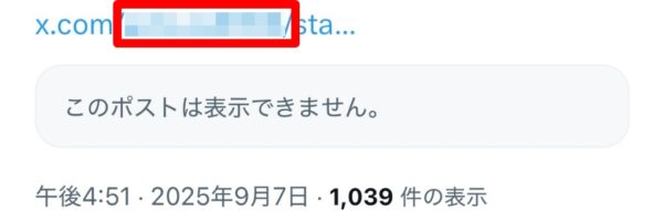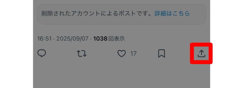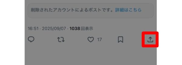 - 「削除されたポスト」を引用している側の投稿(現在も見えている投稿)の共有ボタン(矢印マーク)からリンクをコピーします。