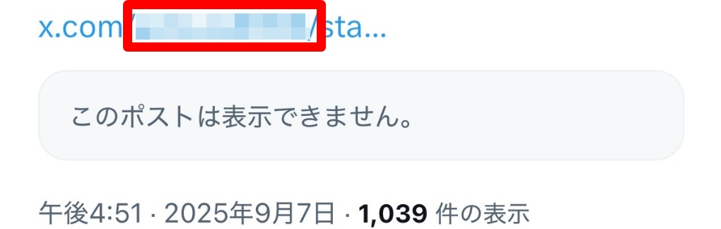 - ブラウザ上で表示させると、元のアカウント(削除されたアカウント)のユーザーIDが表示される場合があります。